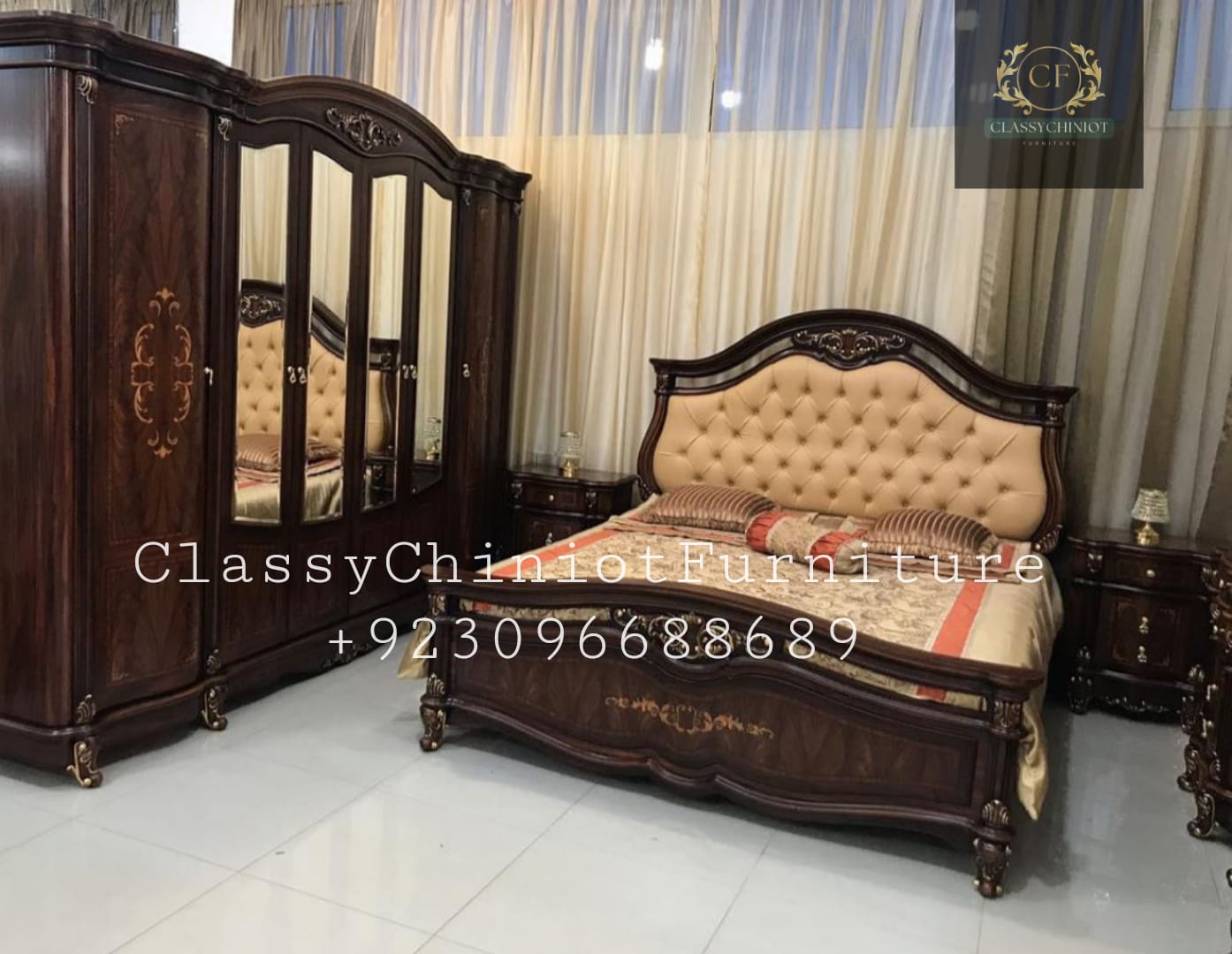 The Classic Chinioti Wooden Bed is a timeless piece of art, handcrafted by skilled artisans from Chiniot Pakistans hub of luxury wooden furniture. This masterpiece features elegant carvings, floral motifs, and a rich walnut finish that defines true royalty.